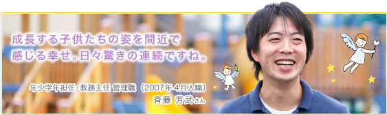 1年目から現場の担任として30名前後の子供たちの保育に携わり、年少、年中、年長の各リーダー(学年のまとめ役、マネジメント)を経験しました。現在は年少組の担任を務める傍ら、教務主任として、当幼稚園の園長と現場とのパイプ役として、問題点の把握やその改善に尽力しています。
